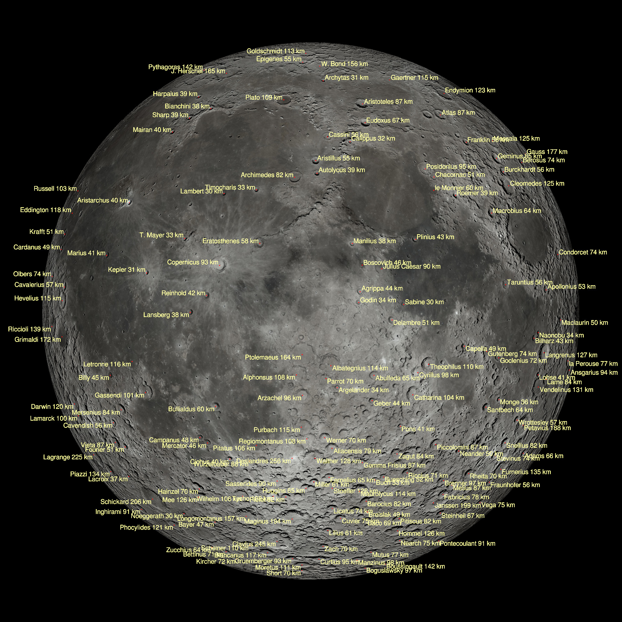 Dafür ergeben sie zusammen fast 9.000 Einträge und enthalten vermutlich alle "Features" (Krater, Mare, Berge, ...) über einem Kilometer Größe.