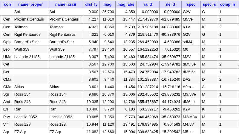 Ich war so frei und habe vom aktuellen HYG-Sternkatalog mit 120.000 Einträgen eine Lite-Version erstellt. Sie enthält weniger Spalten, reduzierte Genauigkeiten und ist um die Hälfte kleiner als das Original. Das Ergebnis kann als SQL-Import und im Form von Povray-Arrays heruntergeladen werden.