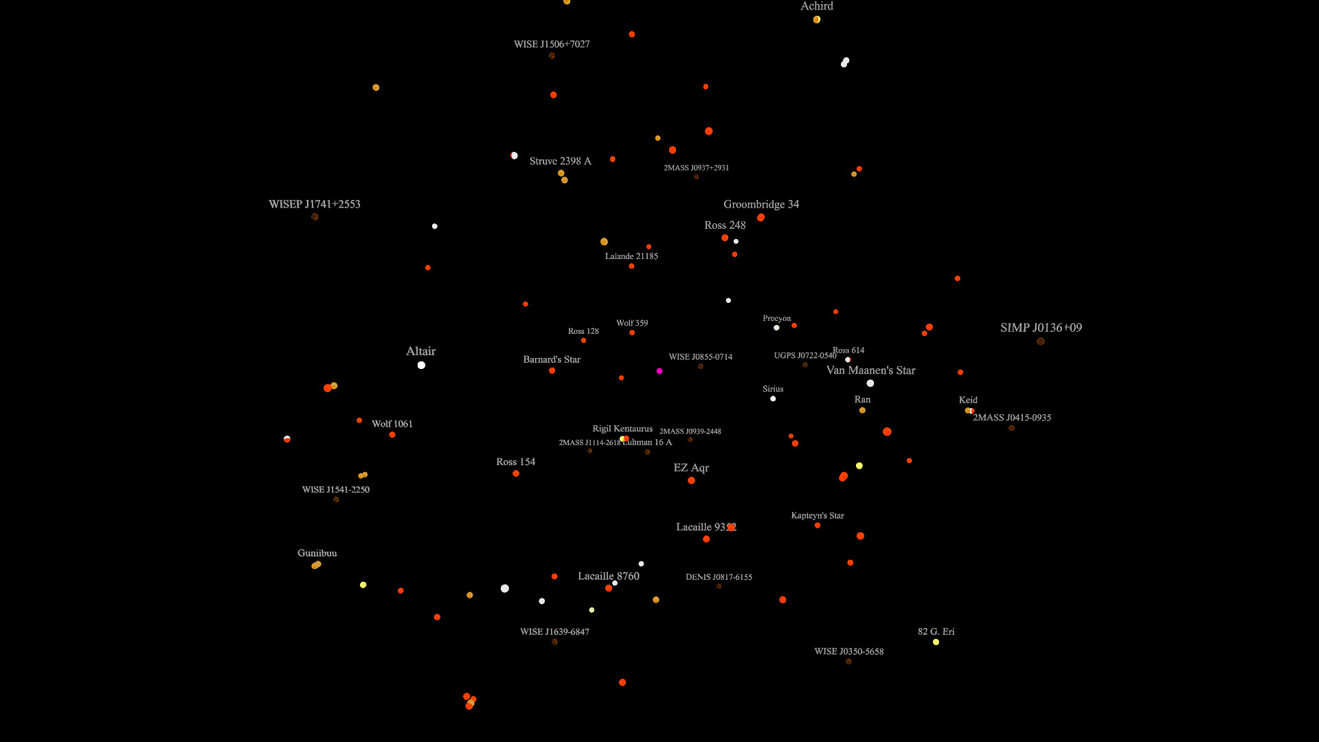 In den letzten Tagen habe ich mit diversen Sterndatenbanken rumgespielt, mit dem Ziel, meine alten Animationen zu verbessern. Dabei stellte sich heraus, rings um unsere Sonne herum ist es ziemlich rot - rote Zwerge, wo man nur hinschaut.