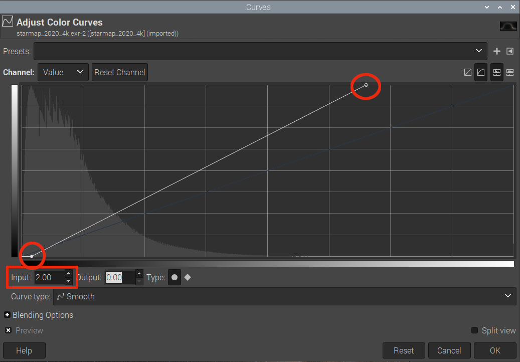 Menü -> Farben -> Kurven leicht verändert, der Zahlenwert 0070 steht für die Werte links-unten (0) und rechts oben (70), bzw. 2 und 66. Da ich mit den Einstellungen noch nicht gänzlich zufrieden bin, sind diese Angaben Teil des Dateinamens, da ich vermutlich bald mehrere Versionen auf der Festplatte habe.