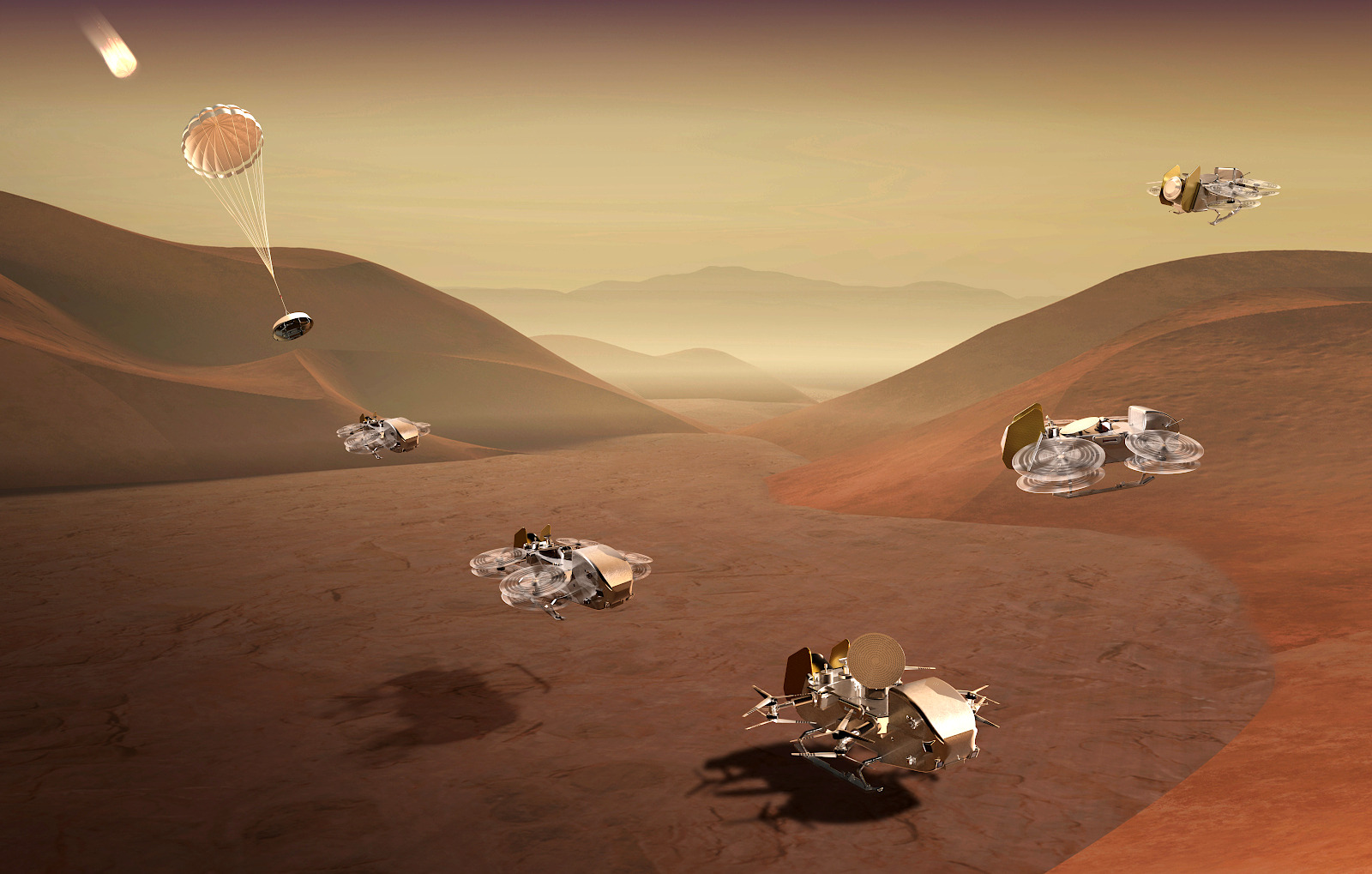 Titan einbremsen, mit Fallschirmen weiter abgebremst, noch im Sinkflug abgekoppelt und seinen 8 Rotoren übergeben werden. Nach der Landung werden über eine Woche lang Daten zur Erde gesendet, anschließend eine neue Landestelle angeflogen und wieder eine Funk-Pause eingelegt.