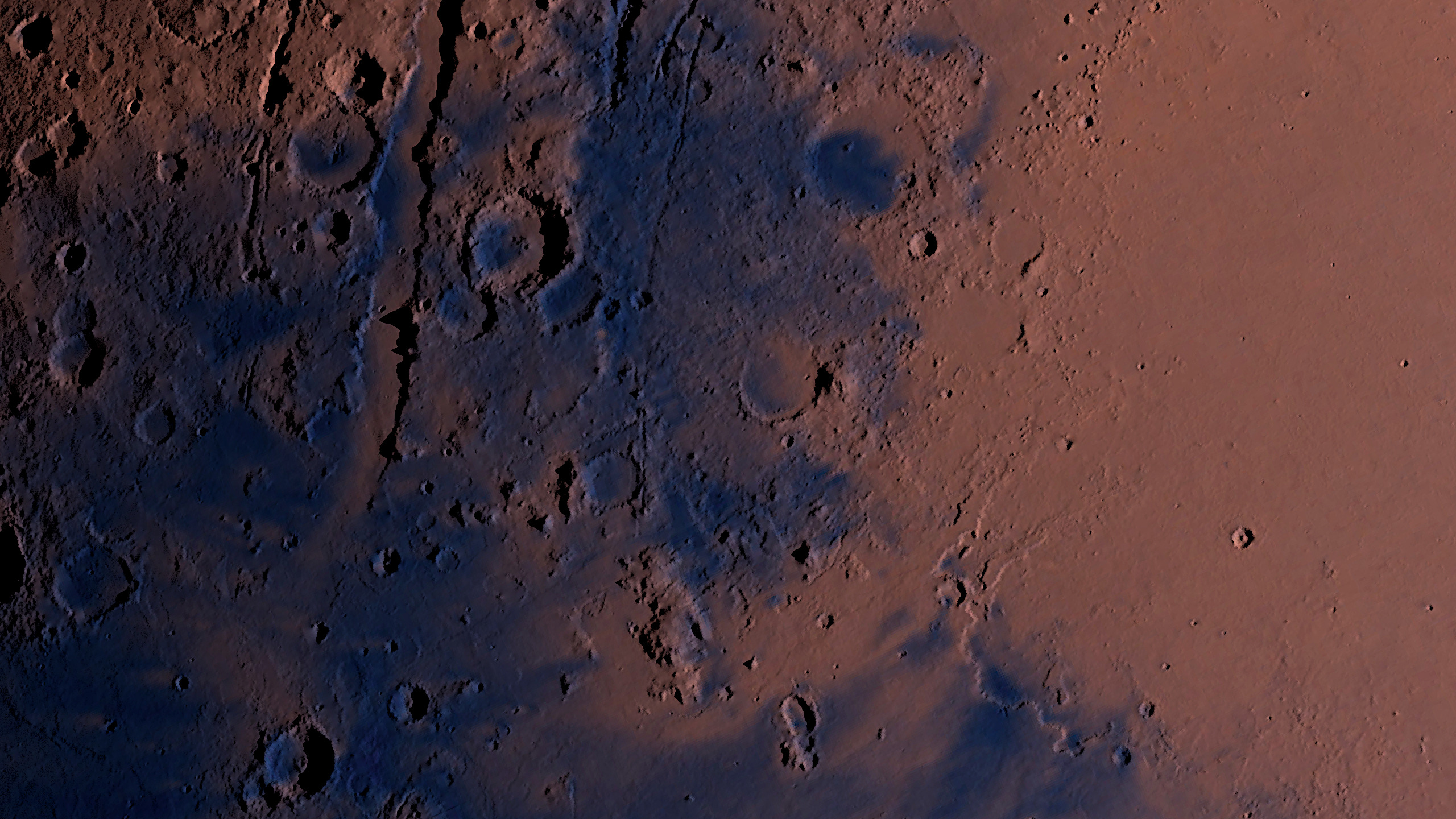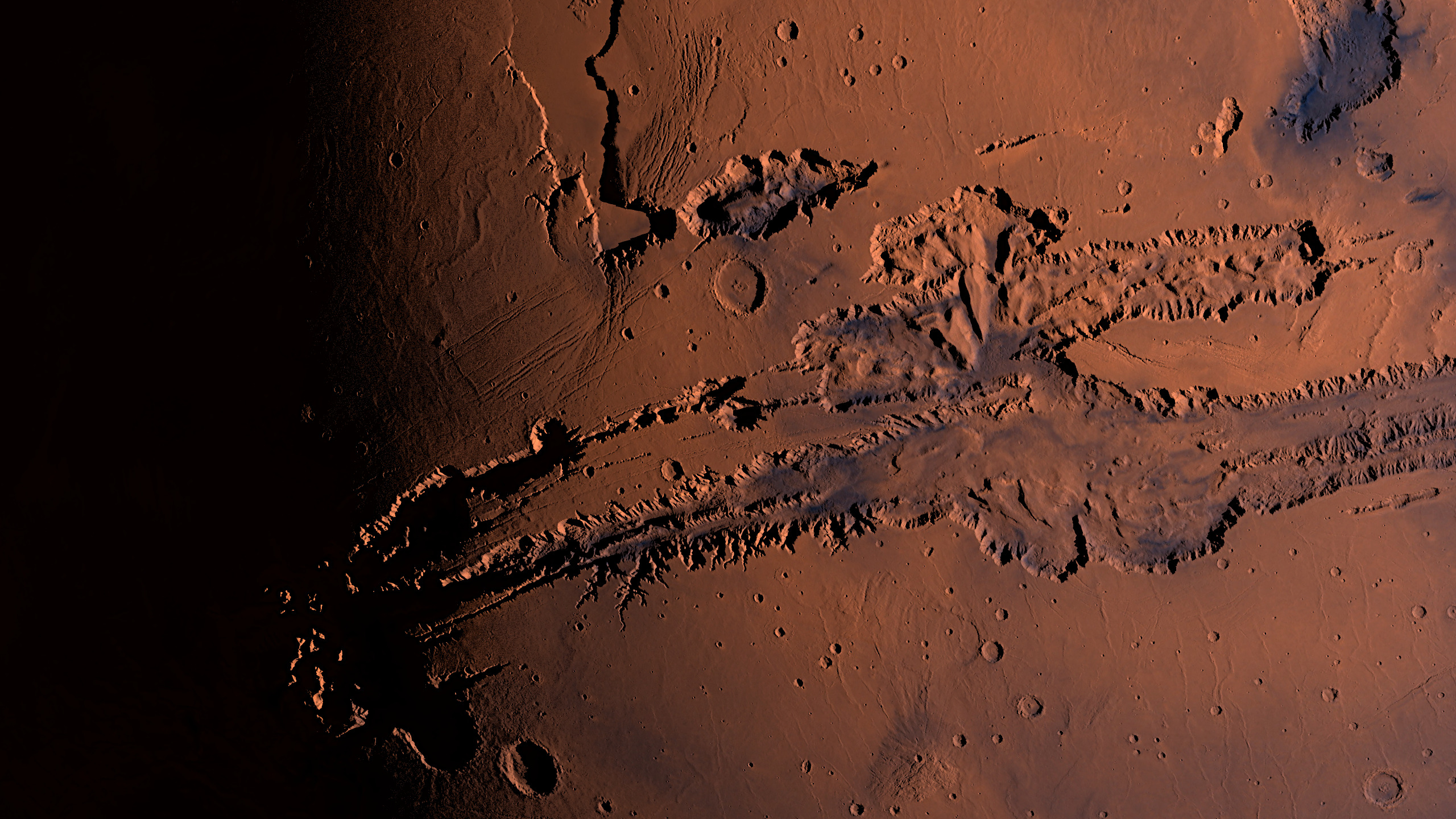 The Valles Marineris is an impressive 4,000 kilometers long from left to right, the size of Australia, of which only the western 2,500 kilometers can be seen here.